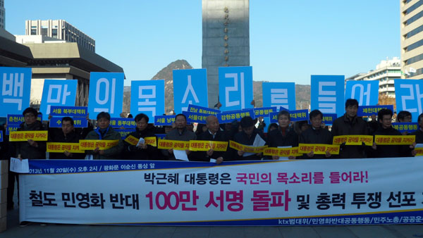 ‘KTX민영화저지 철도공공성강화 범국민대책위원회(범대위)’는 20일 오후, 광화문 이순신 동상 앞에서 기자회견을 열고 “철도민영화 반대 서명운동에 참여한 사람의 숫자가 백만을 돌파했다”며 “이는 철도민영화를 결단코 막아야 한다는 국민들의 의지의 표현”이라고 밝혔다.