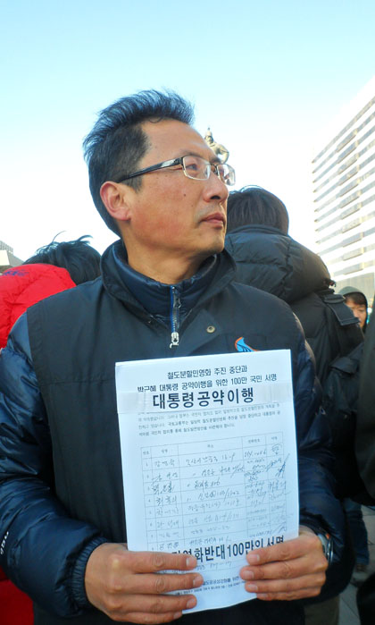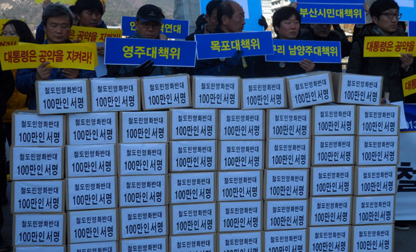 한편 이들은 기자회견문을 통해 “우리는 오늘 100만 명의 서명을 청와대에 전달하고자 한다”며 “이에 불구하고 정부가 계속해서 철도민영화 계획을 추진한다면, 12월에 철도노동자들은 총파업으로 철도를 멈추고, 범대위와 지역대책위의 단체들은 너른 연대투쟁을 건설하여 반드시 민영화를 막아낼 것임을 선포한다”고 밝혔다.
