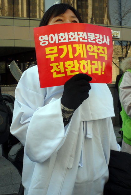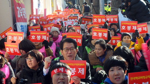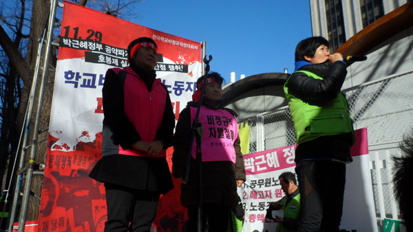 박금자 전국학교비정규직노동조합 위원장 역시 “60일간의 노숙투쟁과 삭발, 단식을 이어가며 총력 투쟁을 다했지만, 학교비정규직 노동자들에게 돌아온 것은 해고의 칼바람이었다”며 “해고라는 살인을 저지르고 있는 정부는 지금 당장 학교비정규직들의 고용을 보장할 것을 경고한다”고 강조했다.