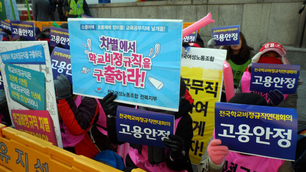현재 학교비정규직노동자들은 정부에 △호봉제 도입 △정액급식비 정규직과 동일한 월 13만원 지급 △명절휴가비 정규직과 동일한 기본급의 60%씩 지급 △상여금 기본급의 100% 지급 △맞춤형복지포인트 정규직과 동일 적용 등과 고용불안 해결 등을 요구하고 있다.