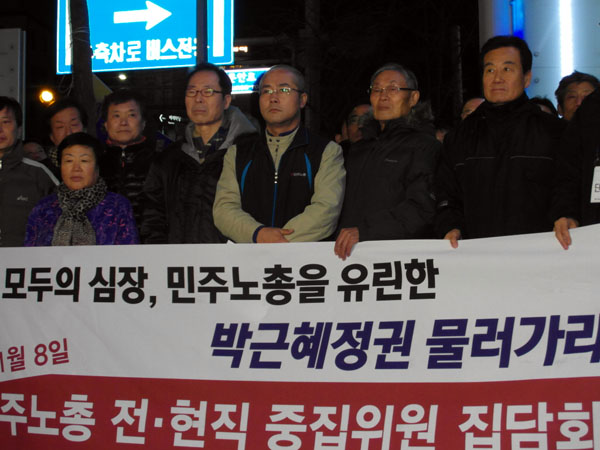 민주노총 전직 중집위원들은 집담회가 끝난 오후 6시 경, 민주노총 앞에서 기자회견을 열고 “민주주의의 후퇴와 더 이상의 죽음을 막는 길은 박근혜 정권이 물러나는 길 뿐”이라며 △박근혜 정권의 노동탄압, 민주주의 파괴에 맞서 투쟁할 것 △오늘 집담회를 시작으로 아래로부터 투쟁을 조직할 것 △국민과 함께 모든 공공재를 민영화 하려는 박근혜 정권에 맞서 투쟁할 것 △평등세상을 앞당기는 역사적 소명을 이룰 것 등을 결의했다.