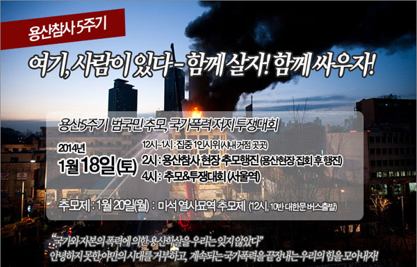 지난 2009년 1월 20일, 다섯 명의 철거민들이 국가 폭력으로 사망하는 용산참사가 발생했지만, 아직까지 진상규명 및 정부의 사과 등이 이행되지 않아 유족을 비롯한 철거민, 시민사회는 5년간의 장기 투쟁을 이어오고 있다.