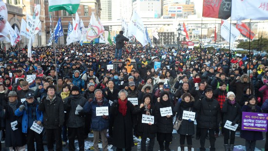 양성윤 민주노총 수석부위원장은 “법과 원칙을 가장 중요하게 생각한다는 박근혜 정권이 민주노총을 침탈했다”며 “민주노총은 불법적인 정권에 맞서 다시 일어나기로 했다”고 밝히고 “김석기, 이명박이 구속되고, 박근혜가 퇴진하는 시발점을 만들 것”이라고 선언했다.