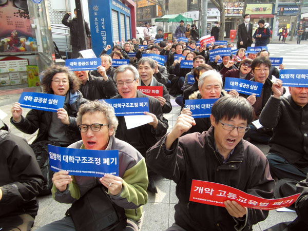 시국대회에 참가한 백도명 민교협 상임의장은 “정부는 비정상의 정상화를 이야기 한다. 이와 함께 대학을 평가하고 퇴출하는 대학구조조정을 단행한다는 방침”이라며 “하지만 진정 비정상적인 것은 대학 이사회와 재단의 운영을 방치한 교과부를 포함한 정부다. 비정상의 정상화를 위해서는 대학을 비정상으로 만든 재단과 교육부 먼저 정상화해야 한다”고 목소리를 높였다.