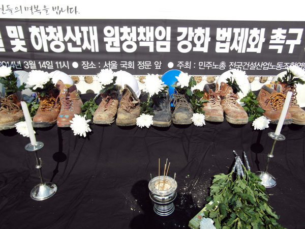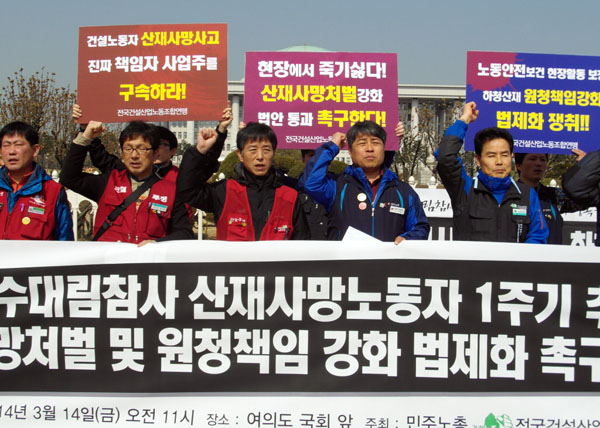 기자회견단은 “현재 국회에는 산재사망사고의 실질적 책임자인 사업주의 처벌을 강화하고, 하청노동자들의 산재에 대한 원청의 책임을 강화하는 7개의 법안이 발의돼 있지만 지금까지 국회 환경노동위원회는 이 법안들에 대해 논의조차 하지 않고 있다”며 “국회는 현재 계류중인 7개의 산재사망처벌 및 원청책임 강화 법안을 조속히 법제화해야 한다”고 요구했다.