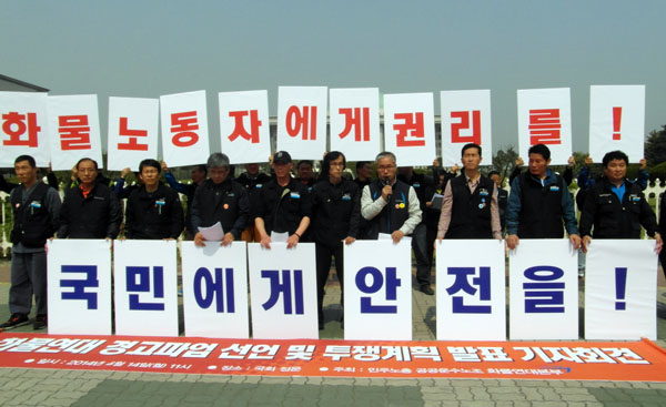 민주노총과 공공운수노조, 화물연대는 14일 오전 11시, 국회 정문 앞에서 기자회견을 열고 “화물연대는 4월 28일 오전 9시부로 하루 경고파업에 돌입한다”며 “국회는 조속히 화물민생법안을 처리해야 한다”고 밝혔다.