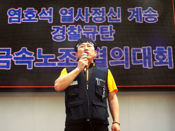 금속노조는 30일 오후 2시, 경찰청 앞에서 ‘염호석 열사정신 계승, 경찰 규탄 금속노조 결의대회’를 개최하고 경찰의 염호석 열사 시신 및 유골함 탈취와 삼성전자서비스 간부 구속을 규탄했다. 이 날 집회에는 파업 후 상경한 전국 확대간부와 삼성전자서비스 노동자 등 2000여 명이 참석했다.