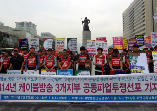 민주노총 서울본부 희망연대노조 소속 씨앤엠 지부와 케이블방송비정규직지부, 케이블방송비정규직 티브로드지부 등 3개 노조는 2일 오전 10시 30분, 광화문 광장에서 기자회견을 열고 파업투쟁을 선포했다.