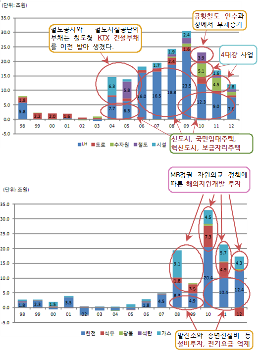 철도공사와 철도시설공단의 부채의 대부분은 KTX 건설부채가 이전 된 것이고, 수자원공사의 부채는 알려진 바처럼 4대강 사업 때문이다. 특히 에너지 공기업의 경우 MB 정권 5년 동안 자원외교의 치적 쌓기에 동원되면서 부채가 급증했다. 한국전력의 부채 역시 설비투자와 전기요금 억제정책에 따른 적자가 부채증가의 가장 큰 요인이다. 이러한 부채증가의 요인들을 볼 때, 이들 공기업의 부채문제가 방만 경영 때문이라고 말하는 건 어불성설이다.