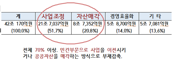 정부에서 지난 2월에 밝힌 ‘중점관리대상기관 부채감축계획(안)’을 보면 공기업 부채감축이 가리키는 방향을 엿볼 수 있다. 정부는 2017년까지 공기업 부채 규모를 42조 가량 줄이기로 계획을 세웠는데, 아래 그림에서 보듯 사업조정과 자산매각의 비중이 70%를 넘는다.