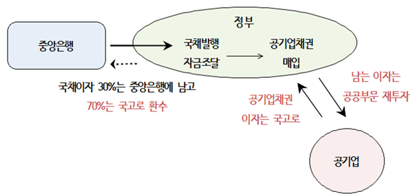 그러므로 앞서 부채문제가 심각하게 제기된 철도공사와 철도시설공단 사례처럼 정부가 이들에게 전가했던 부채를 다시 회수하는 것이 필요하다. 회수자금은 중앙은행이 국채를 인수하고 정부는 이 돈으로 공기업 채권을 매입하면 된다. 중앙은행이 획득한 국채이자의 70%는 국고로 환수되기 때문에 이자비용이 30%로 줄어든다. 산술적으로 계산해 보면 철도공사와 철도시설공단이 매년 지불하는 1조 원 대의 이자비용을 0.3조원으로 낮출 수 있는 셈이다.