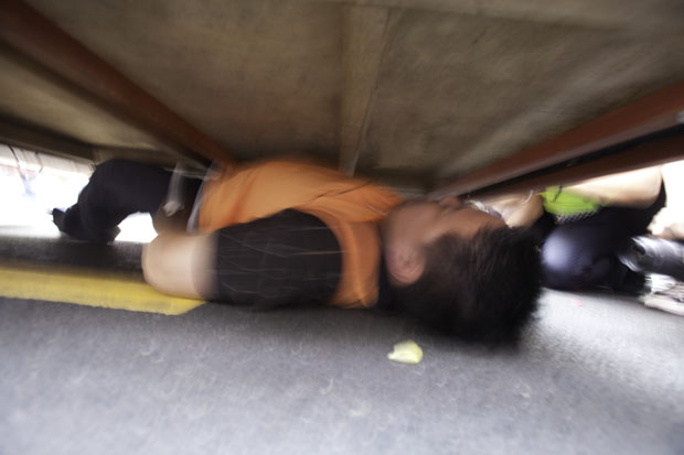 ▲ 아수라장이 된 퍼레이드. 맨 앞에 보수 교인들 2-300여 명이 누워 있고, 경찰이 충돌을 막기 위해 중간에 있다. |