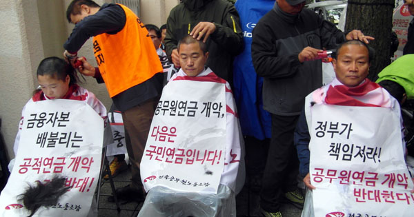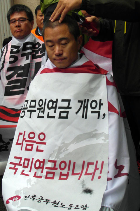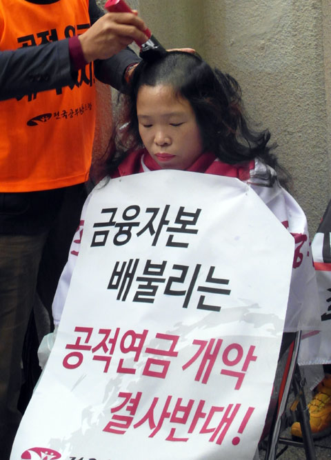 서정숙 경기본부장 역시 “어제 가족들과 외식을 하며 남편과 아이들에게 삭발을 하겠다고 이야기했다. 대학생 아들은 당당하게 삭발하라며 응원을 해 줬다. 나 역시 공무원연금 개악 저지를 위해 당당하게, 쉼 없이 투쟁을 해 나갈 것”이라고 강조했다. 집회 이후에는 참가자 300여 명이 ‘금융자본 배불리는 공적연금 개악 결사반대’, ‘공무원연금 개악, 다음은 국민연금입니다!’등의 구호가 새겨진 소형 현수막을 들고 서울 시청에서 청와대까지 1인 시위를 벌였다.