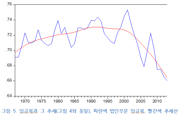 따라서 적어도 우리가 지금까지 평가한 임금몫은 불평등 증가의 지표도 될 수 없고, 그에 따라 만들어진 두 가지 성장모형(부채-주도, 수출-주도)이 형성된 원인이라고 볼 수 없다. 따라서 우리는 <그림4>, 즉 법인부문 임금몫의 변화를 임금몫의 변동 또는 추세를 판단하는 지표로서 사용한다. 게다가 변동폭이 아주 작은 변수임으로 그것을 추상할 수 있는 축의 범위를 부여하는 것이다. <그림5>와 <그림6>은 임금몫에 대한 잘못된 정보를 전달할 수 있다.