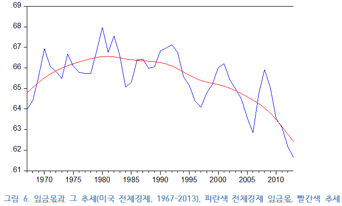 새로운 그림이 등장하였다. 사실 <그림4>에서는 축의 범위가 넓기 때문에 <그림5>와 같은 변동분이 사라진다. 하지만 축의 범위를 좁히면 새로운 그림이 등장하는 것이다. 어떤 사람들은 이러한 이유로 통계는 믿기 어렵다라거나 조작하는 사람의 이론적 의지가 상당히 반영된다는 소리를 하는 사람이 있지만, 거꾸로 이야기해보면 축의 범위가 넓을 때 저런 <그림5>와 같은 변동이 관찰되지 않는다는 것은 변동의 범위가 너무 작다라는 말이기도 하다. 어쨌든 저 변동을 고려하여 보자. 1) 2000년대 이전, 즉 미국에서 발생한 큰 위기 이전 미국 임금몫의 경향은 오히려 상승추세이다. 2) 하락경향이 있다면 그것은 2000년대 이후, 즉 위기들의 결과로밖에 볼 수 없다.