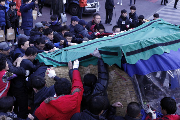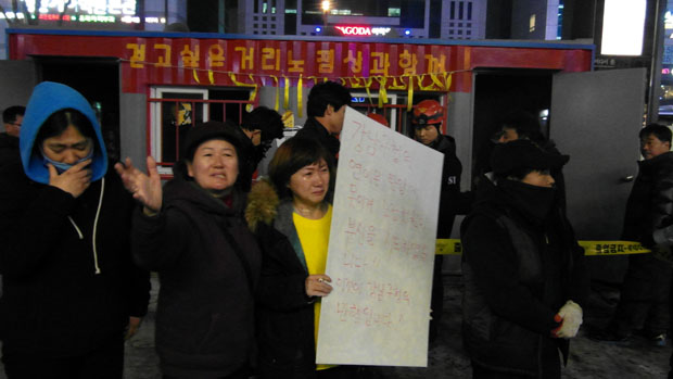 불에 탄 농성장 앞에서 동료 노점상들은 오열했다. 노점상들은 “합법적으로 노점을 운영하게 해 달라고 그렇게 부탁했는데도, 강남구청은 우리와 대화도 하려하지 않는다”며 “제발 저희를 살게 해 달라. 없는 사람도 강남 대로에 살게 해 달라”며 울음을 터뜨렸다.
