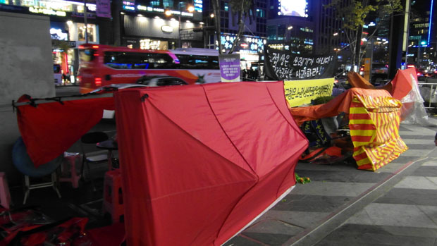 노점상 김모(54. 여) 씨는 “장사를 하고 있는데 갑자기 용역이 들이닥쳤다. 끓는 물 앞에서 장사를 하고 있는데, 아랑곳 하지 않고 마차를 엎어버렸다”며 “매일 용역들이 들이 닥칠까봐 불안하고 두렵다. 언제 마차가 부서질지 몰라 매일 농성장에서 쪽잠을 자고 있다. 강남구청은 돈도 많은 것 같다. 수억의 예산을 용역을 고용하는데 쓰고 있다”고 울분을 토했다.