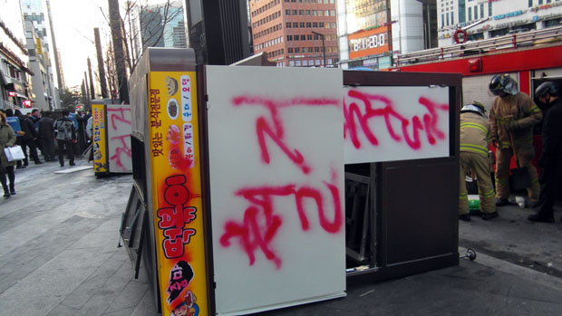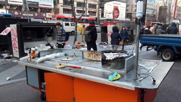 강남대로 노점상들은 지난달 9일 밤, 대로변에 규격마차 4대를 들여놨다. 전국 곳곳에서 규격마차를 통한 노점상 양성화 정책이 추진되고 있는 만큼, 불법 노점이 아닌 합법적으로 노점을 운영할 수 있게 해 달라는 요구였다. 하지만 규격마차 4대는 모두 훼손됐고, 강남구청은 지게차를 동원해 2대의 규격마차를 압수해 갔다. 컨테이너 농성장 옆에 마련된 식당 천막도 모두 부서지고 철거됐다.