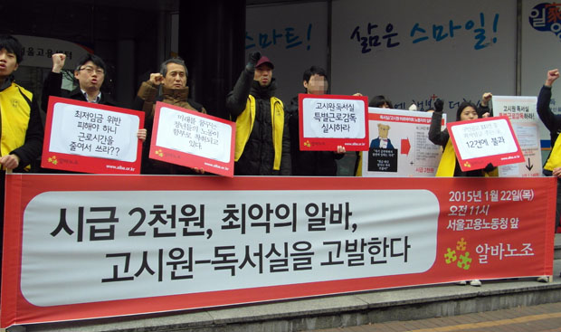 알바노조는 22일 오전 11시 서울고용노동청 앞에서 기자회견을 열고, 노동부에 고시원, 독서실 아르바이트와 관련한 특별근로감독을 요구했다. 고시원 아르바이트 노동자 K씨는 이날 노동청에 체불임금 관련 진정서를 제출했다.