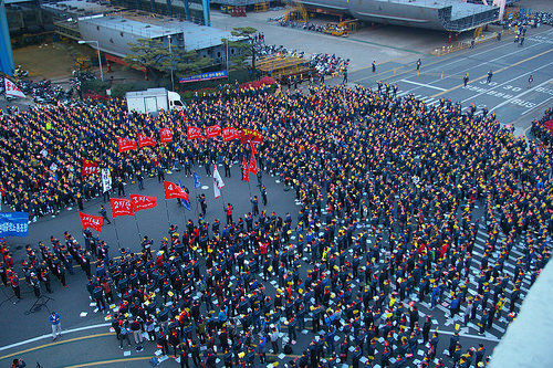 현대중공업노동조합이 23일 현대중공업 시계탑 사거리에서 ‘2015년 임금협상 투쟁 승리 출정식’을 가졌다. 현대중공업노조는 출정식에서 구조조정을 진행하는 권오갑 사장을 비판했다. 현대중공업노조는 기본급 12만7560원 인상, 노후연금 현실화 등을 올해 임금협상 요구안으로 한다. 이날 출정식에는 현대중공업노조 조합원과 현대중공업 사내하청지회 조합원 등 2500여 명이 참석했다.