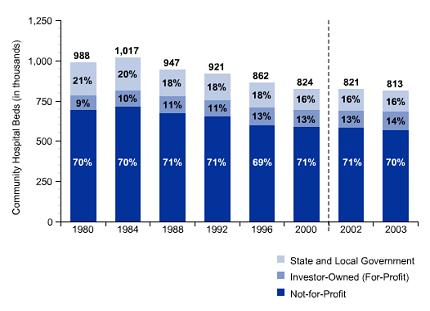 미국의 보건의료제도가 시장 중심이라고 비판하거나 혹은 옹호하는 주장을 듣노라면, 미국에는 영리병원이 절대 다수인 것으로 오해하기 쉽다. 물론, 영리법인이 상대적으로 높은 비중을 차지하고 있다는 점은 다른 선진국들과 구분되는 미국 사회의 특징이며, 그 비중 또한 분명 늘어나고 있다. 하지만, 2003년 현재 지역사회병원(community hospital) 병상 중 영리기관이 차지하고 있는 비율은 아직 14%에 지나지 않는다. 전체 병상 중 84%를 민간이 소유하고 있으나(2), 민간=영리라고 말할 수 없으며 민간 병원의 대부분은 비영리 재단에 의해 운영되고 있다.
