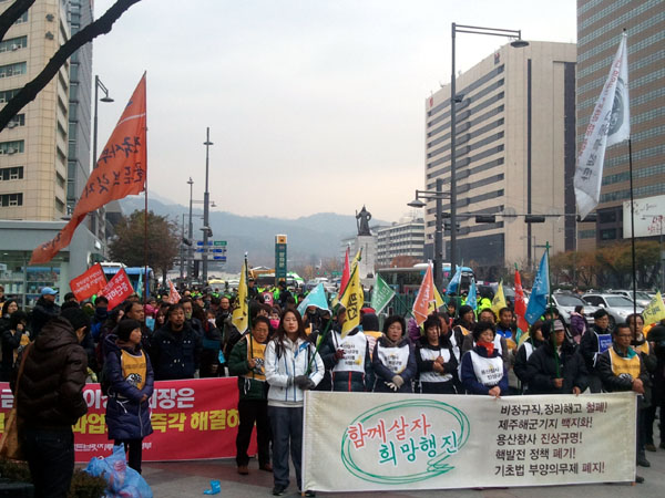 우리는 대통령 후보로 나서신 분들이 송전탑을 오를 수밖에 없는 노동자들의 절박함까지 진심으로 알아주기를 바라지는 않는다. 하루 24시간 레미콘이나 시멘트 구조물보다 못한 취급을 받으며 한나절에 몇 번씩 경찰들에게 팔이 꺾여 들려나오며 인간 존엄의 모욕을 감수하면서도 제주 해군기지 건설을 1초라도 지연시키겠다는 평화지킴이들의 눈물을 닦아 주기를 기대하지도 않는다.