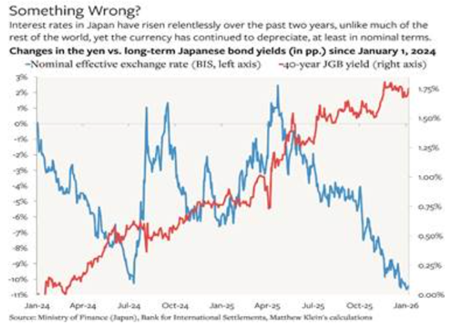 뭔가 잘못되고 있는가일본의 금리는 지난 2년 동안 세계 대부분의 국가들과 달리 끊임없이 상승해 왔다그럼에도 통화 가치는적어도 명목 기준으로는계속해서 하락해 왔다<2024년 1월 1일 이후 엔화와 일본 장기 국채 수익률의 변화(%p)>
