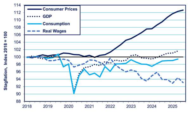 침체 대신 일본 경제는 이제 스태그플레이션으로 변모했다물가는 오르고, GDP와 소비 지출은 정체되어 있으며실질 임금은 하락하고 있다소비자물가는 2021년 이후 12% 상승했다반면 GDP는 2018년과 거의 차이가 없다소비 지출 역시 정체 상태인데이는 실질 임금이 2018년 수준보다 7% 하락했기 때문이다.