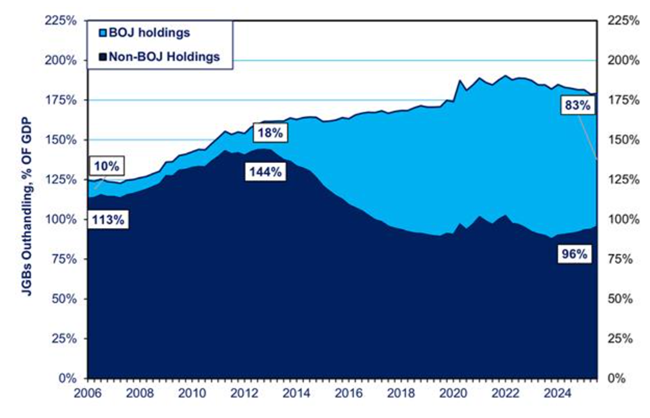 그렇다면 다카이치의 정책은 영국에서 리즈 트러스가 그랬던 것처럼 일본 국채 시장의 붕괴로 이어질 것인가나는 그렇게 보지 않는다일본 국채의 대부분은 일본 국내에서 보유되고 있으며 그 비율은 88%에 달한다이는 영국과는 다르다자본 유출 위험은 민간 투자자가 보유한 부분즉 순부채에만 존재한다그리고 이 순부채 규모는 수십 년 만에 가장 낮은 수준이다이는 주로 일본은행이 2013년 이후 대규모로 국채를 매입해 왔기 때문이다. 2013년 초 민간 채권자가 보유한 순정부부채는 GDP 대비 144%로 정점을 찍었지만현재는 96%에 불과하다(아래 도표 참조).