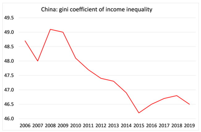 또한 중국은 국제 기준으로 볼 때 소득 불평등 수준이 높은 편이다다만 그 수준은 브라질멕시코남아프리카공화국과 같은 다른 많은 신흥 경제국들보다는 여전히 낮다그리고 지니 계수는 대침체 직전에 정점을 찍은 뒤 그 이후로 하락해 왔다이처럼 불평등 비율이 높은 주요 이유는 도시 노동자와 농촌 노동자 사이의 소득 격차연해 지역 도시와 내륙 도시 사이의 임금 격차그리고 교육 수준의 차이 때문이다.