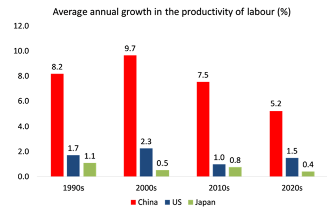노동연령 인구가 감소하는 경제에서는 생산성 증가가 핵심이다중국의 생산성 증가율은 과거의 매우 높은 수준에서 다소 떨어졌지만여전히 선진 자본주의 경제들보다 훨씬 높은 수준을 유지하고 있다.