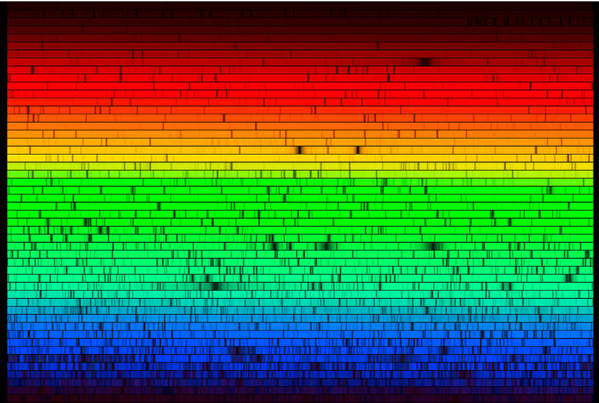 대부분의 별은 스펙트럼(여기서는 태양의 경우처럼)에서 일부 색이 결여된 모습을 보이며, 이는 별의 대기가 특정 파장의 빛을 흡수하기 때문이다. 그러나 감마 카시오페이아(Gamma Cassiopeiae)는 스펙트럼의 다른 부분보다 더 밝은 방출선을 함께 보여 천문학자들을 놀라게 했다. 출처: 미국국립광학천문대(NOAO) / AURA / 미국국립과학재단(NSF), CC BY