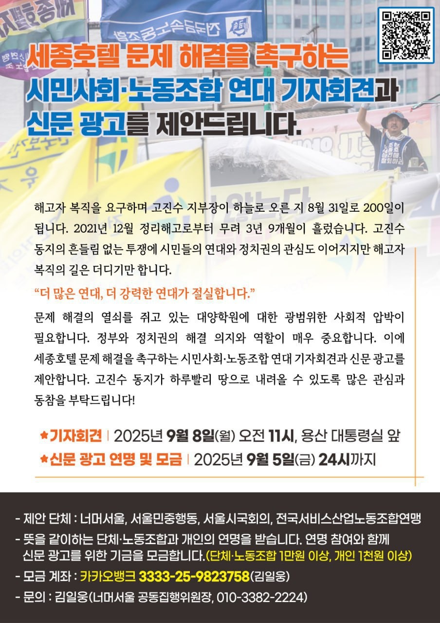 너머서울과 전국서비스산업노동조합연맹 등은 세종호텔 문제 해결을 촉구하는 시민사회·노동조합 연대 기자회견과 신문 광고를 제안했다.