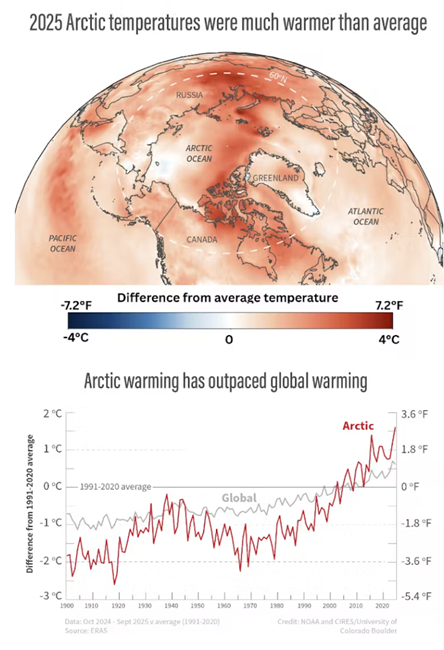 2024년 10월부터 2025년 9월까지의 지난 수문 연도는 125년 전 관측이 시작된 이래 가장 높은 북극 기온을 기록했다이 기간에는 관측 이래 가장 따뜻한 가을이 포함되었고겨울과 여름 역시 기록상 가장 따뜻한 해들 가운데 하나였다전체적으로 볼 때 북극은 지구 전체 평균보다 두 배 이상 빠른 속도로 온난화되고 있다.