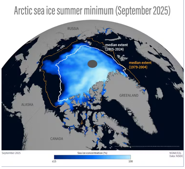 2025년 9여름 말 연간 최소기에 해당하는 북극 해빙 농도는 1979~2004년 중위값보다 훨씬 작았다파란색의 농도는 해빙의 밀집 정도를 나타낸다. 출처: 미국 해양대기청과 콜로라도대학교 볼더 캠퍼스 산하 CIRES