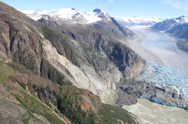 항공 사진은 후퇴하는 빙하와 영구동토층 융해 가능성이 노출된 계곡 사면에 어떤 영향을 미쳤는지를 보여준다. 2025년 8월 10일 알래스카 사우스 소여 빙하에서 발생한 산사태의 결과를 담은 항공 사진이다산비탈의 밝은 부분이 붕괴가 발생한 지점이다출처: 미국 지질조사국