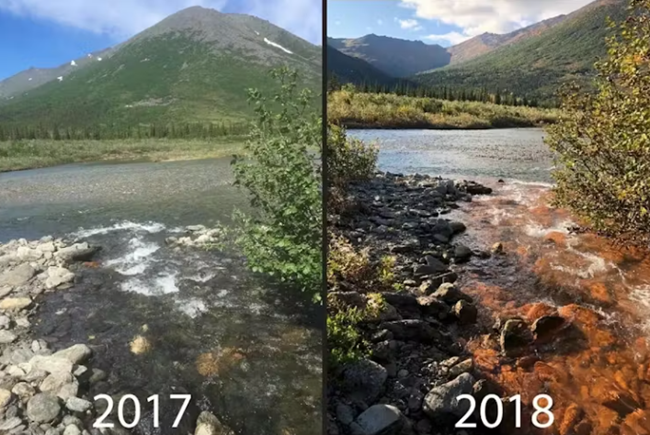 융해되는 토양이 철과 기타 광물을 방출하면서알래스카 북극 전역의 200개가 넘는 유역에서 주황색 변색이 관측되고 있다이 물들은 산성이 더 높고 독성 금속 농도도 상승해어류 서식지와 식수를 오염시키고 자급적 생계에 영향을 미칠 수 있다.