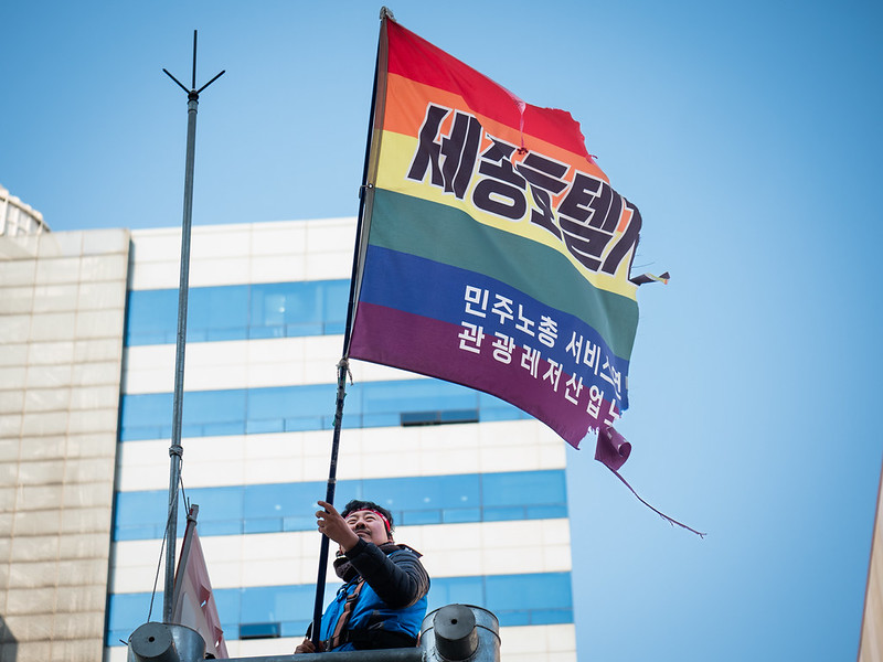 고진수 세종호텔지부 지부장이 낡삭아 반쪽만 남은 깃발을 흔들고 있다. 참세상 박도형 기자