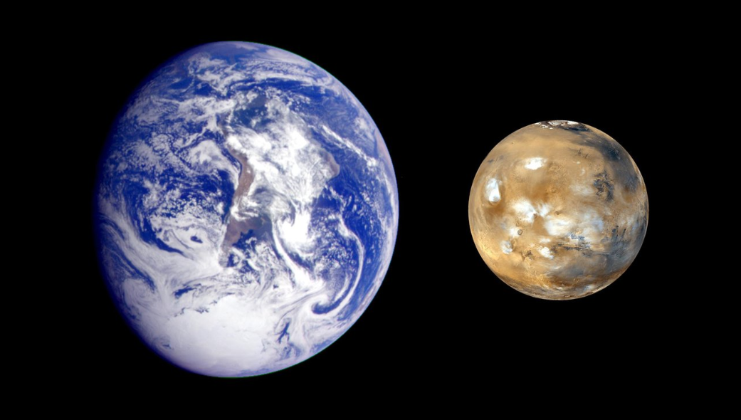 지구와 화성의 상대적인 크기를 보다 잘 이해할 수 있도록 제작된 합성 이미지다. 출처: NASA/JPL-Caltech