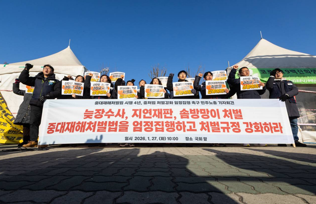 중대재해처벌법 시행 4년을 맞아 민주노총이 법의 엄정 집행과 처벌 강화를 촉구하며 전국 동시다발 기자회견을 열었다. 민주노총은 중대재해 발생과 사망자 수가 줄지 않는 현실은 “솜방망이 처벌과 미흡한 법 집행 때문”이라고 지적했다.
