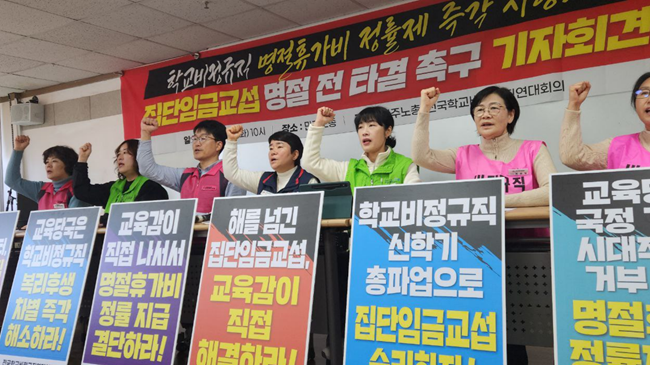 학교비정규직 노동자들이 설 명절을 앞두고 명절휴가비 차별 해소와 집단임금교섭 타결을 촉구했다. 이들은 명절 전 교섭이 결렬될 경우 신학기 총파업이 불가피하다고 밝혔다.