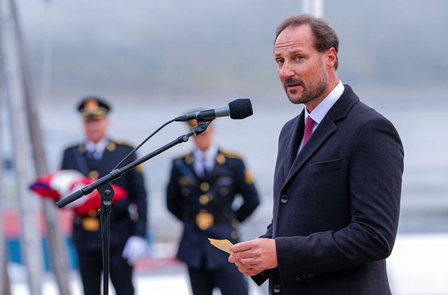 노르웨이의 왕세자 호콘(Haakon)이 2025년 8월 14일 스발바르가 노르웨이 왕국의 일부가 된 지 100주년을 맞아 스발바르를 방문해 스캬링가(Skjarringa) 기념비 앞에서 연설하고 있다.
