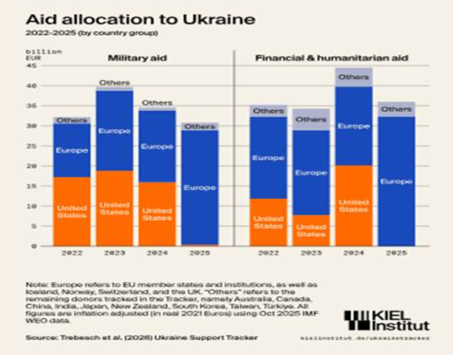 2025년 유럽의 지원은 눈에 띄게 증가했다. 군사 지원 배정액은 67% 늘었고, 재정 및 인도적 지원은 59% 증가했다. 전체 민간 지원에서 유럽연합이 차지하는 비중은 전쟁 초 약 50% 수준에서 90%로 상승했다. 그러나 미국의 지원 철회로 인해 2025년 전체 군사 지원은 여전히 13% 감소했고, 민간 재정 지원도 실질 기준으로 5% 줄었다.