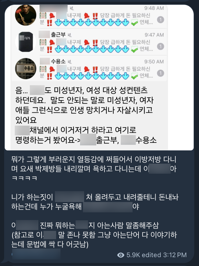 사회운동진영의 후원 계좌가 허위 신고로 잇따라 지급정지되는 사태가 발생했다. 취재 결과, 그 배후에는 텔레그램을 기반으로 한 범죄 네트워크가 있는 것으로 확인됐다. 이들의 방식은 통장을 묶는 신종 사기 수법에 그치지 않고, 성 착취와 불법도박 등 다양한 디지털 범죄와도 긴밀히 연결돼 있었다. 참세상은 신종 금융사기 배후의 텔레그램 범죄 네트워크 실태를 두 차례에 걸쳐 보도한다. 취재 과정에서 확보한 자료는 연재에 앞서 경찰에 일괄 전달했다.