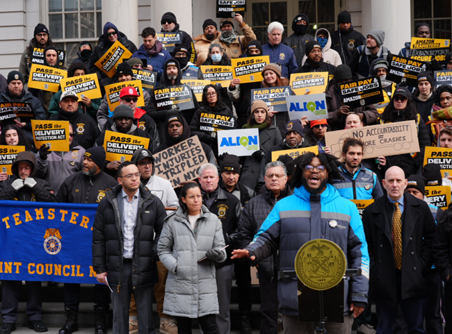 지난 2월 13일, 아마존 팀스터즈가 뉴욕시청 앞에서 기자회견을 열고 ‘배송 보호법’의 통과를 촉구했다. 출처 : 팀스터즈 페이스북