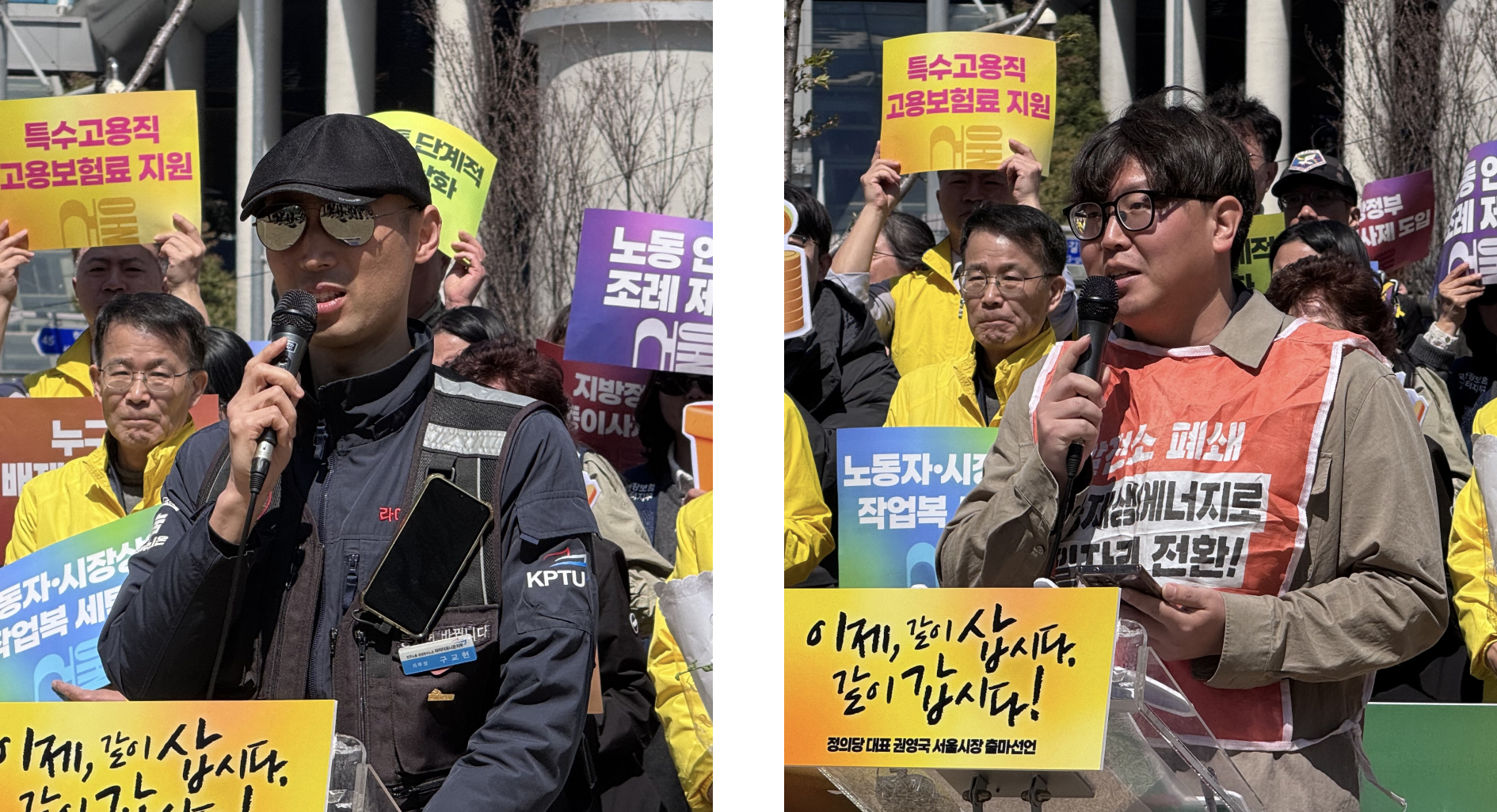 구교현 공공운수노조 라이더유니온지부장(왼쪽), 김영훈 공공운수노조 한전KPS비정규직지회장(오른쪽). 참세상 류민