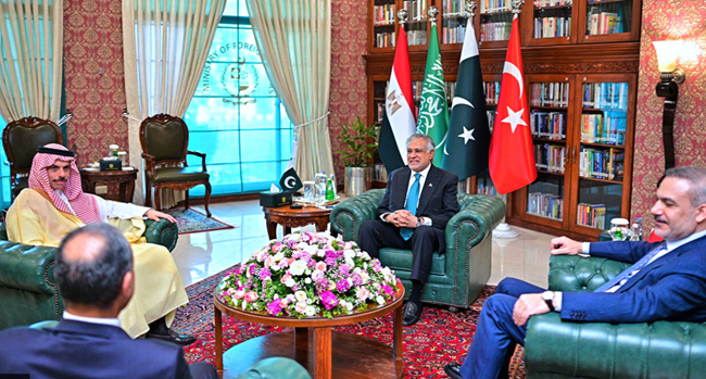 튀르키예 외무장관 하칸 피단(Hakan Fidan), 사우디아라비아 외무장관 파이살 빈 파르한 왕자(Prince Faisal bin Farhan), 이집트 외무장관 바드르 압델라티(Badr Abdelatty), 파키스탄 부총리 이샤크 다르(Ishaq Dar)가 3월 29일 파키스탄 이슬라마바드에서 열린 회의에 참석했다. 출처: 파키스탄 외무부