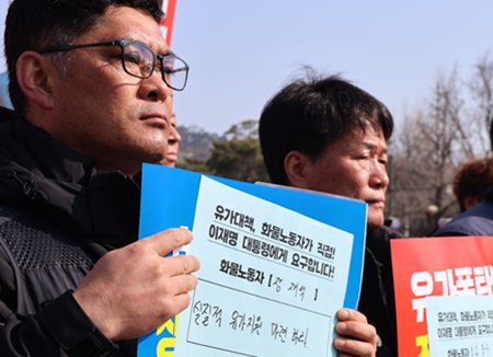 경유값 급등으로 화물노동자들의 적자 운송이 심화되고 있다며 화물연대가 정부에 긴급 대책 마련을 촉구했다. 민주노총 공공운수노조 화물연대본부는 12일 청와대 앞에서 ‘유가폭탄 적자운송 경유값 폭등 대책 마련 촉구’ 긴급 기자회견을 열고 유가 급등에 따른 화물노동자의 생존 대책을 요구했다.