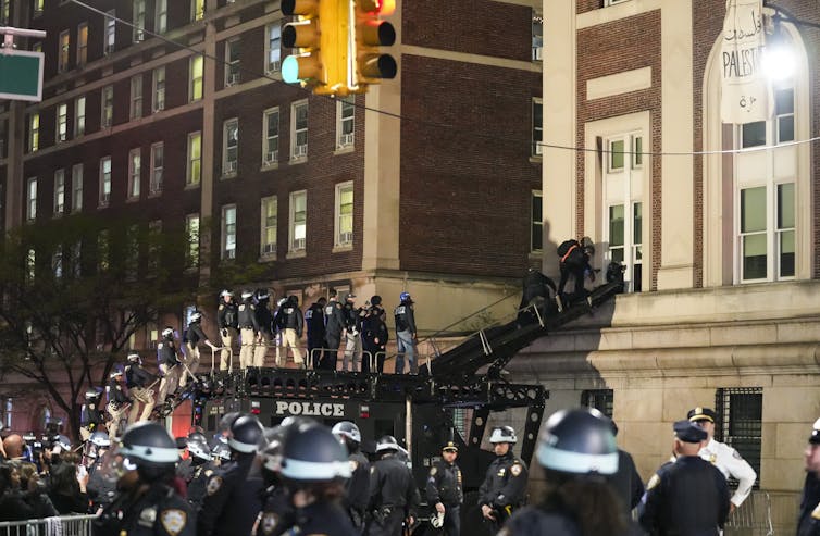2024년 4월 30일, 학생들이 바리케이드를 쳤던 컬럼비아대학교의 해밀턴 홀에 들어가는 뉴욕시 경찰. EPA-EFE/Stephani Spindel