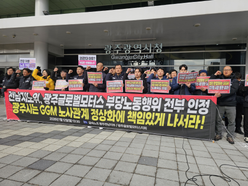 전남지방노동위원회가 광주글로벌모터스(GGM)의 부당노동행위를 모두 인정한 가운데, 금속노조 광주전남지부와 광주글로벌모터스지회가 12일 광주광역시청 앞에서 기자회견을 열고 “광주시는 최대주주로서 노사관계 정상화에 책임 있게 나서야 한다”고 촉구했다. 이들은 이날로 시청 앞 천막농성이 50...